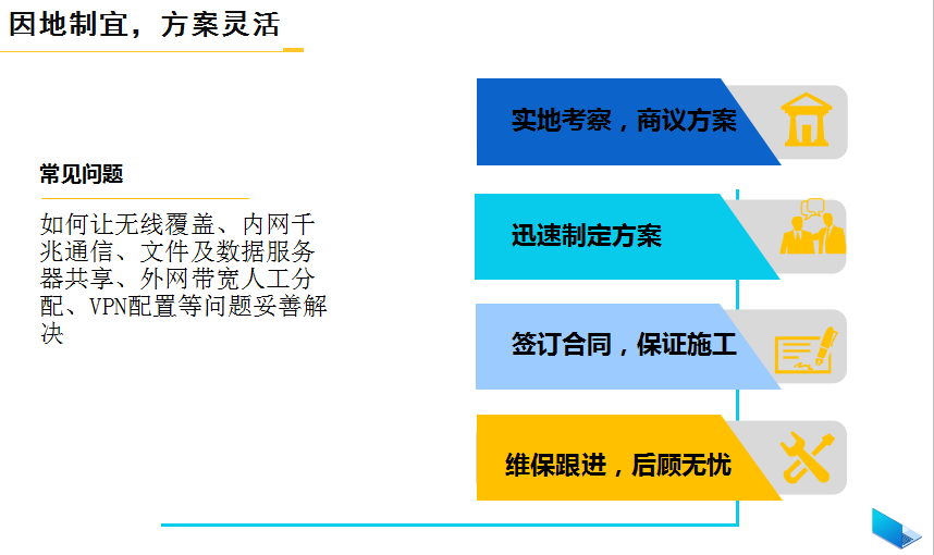 常見問題如何讓無線覆蓋、內網千兆通信、文件及數據服務器共享、外網帶寬人工分配、VPN配置等問題妥善解決因地制宜,方案靈活1 實地考察,商議方案2 迅速制定方案3 簽訂合同,保證施工4 維保跟進,后顧無憂