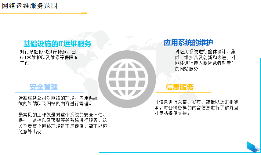 基礎(chǔ)設(shè)施的IT運(yùn)維服務(wù)對(duì)IT基礎(chǔ)設(shè)施進(jìn)行檢測(cè)、日bai常維護(hù)以及維修等保障du工作應(yīng)用系統(tǒng)的維護(hù)對(duì)應(yīng)用系統(tǒng)進(jìn)行整體設(shè)計(jì)、集成、維護(hù)以及創(chuàng)新和改進(jìn),對(duì)網(wǎng)絡(luò)進(jìn)行接入服務(wù)或者對(duì)專門的網(wǎng)站服務(wù)安全管理運(yùn)維服務(wù)公司對(duì)網(wǎng)絡(luò)的環(huán)境、應(yīng)用系統(tǒng)、系統(tǒng)的終端以及網(wǎng)站的內(nèi)容進(jìn)行管理。最常見的工作就是對(duì)整個(gè)系統(tǒng)的安全評(píng)估、保護(hù)、監(jiān)控以及預(yù)警等等系統(tǒng)進(jìn)行服務(wù),這關(guān)乎著整個(gè)網(wǎng)絡(luò)環(huán)境是不是健康,能不能避免意外出現(xiàn)。信息服務(wù)對(duì)信息進(jìn)行